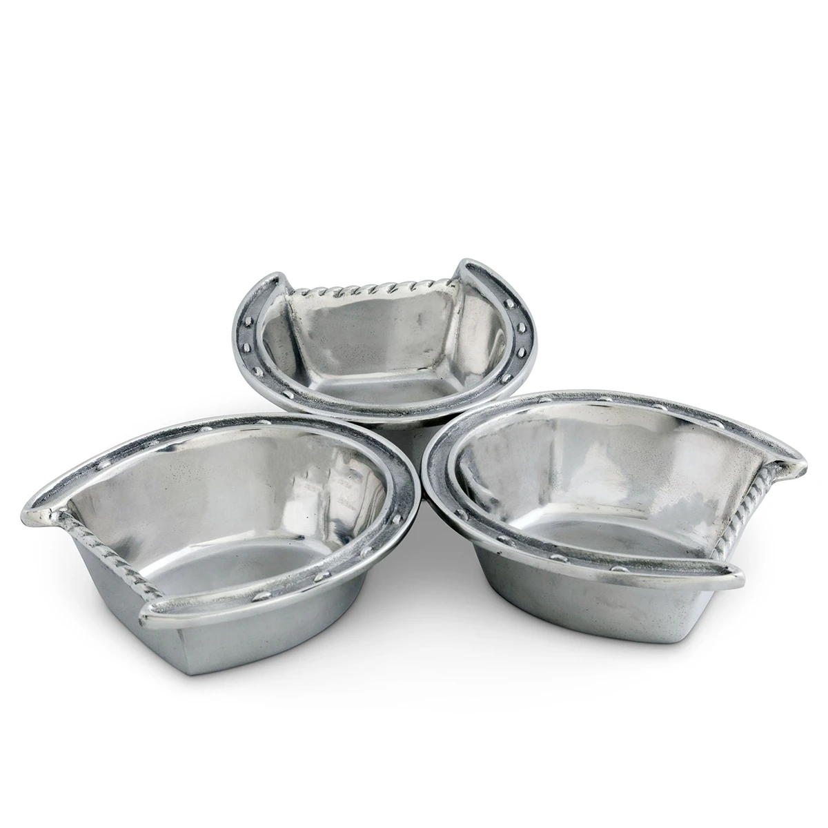 Put your hooves together for this 3-Bowl Horseshoe Bowl from Arthur Court. Three horseshoes touch at the toe, the rim of their walls showing realistic nail markings.