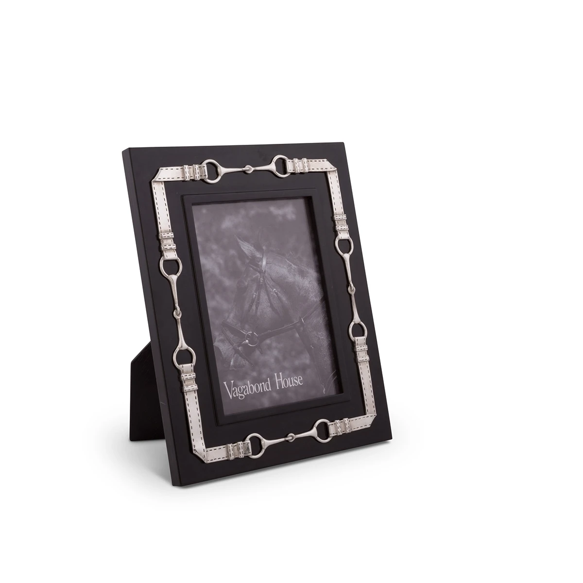 Frame your favorite Equestrian in our luxurious black wood photo frame embellished with pewter egg butt snaffle bits joined by detailed leather bridle straps in a repeating pattern.