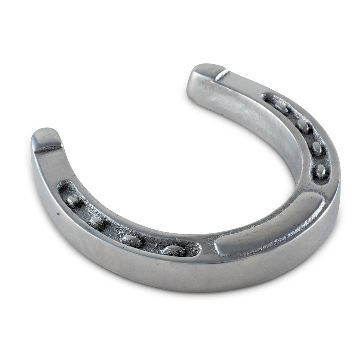 Host a carefree barbecue in style with this Arthur Court horseshoe napkin weight gracing your table. This attractive weight is shaped like a small horseshoe, perfect for equestrian-themed gatherings. Eight nails (four on each side of the piece) with a rounded plate at the shoe’s toe make this attractive item realistically resemble a horse’s shoe in miniature. The weighted 3.5 x 3.5-inch piece keeps paper or cloth napkins from blowing away when dining outdoors. You can also use this charming horseshoe to hold down papers on a desk, or simply place it on a countertop or table to display your love for horses. To clean, simply dust the horseshoe with a damp cloth. As an added perk, this horseshoe napkin comes in a gift box, making it the perfect present for equestrians.
