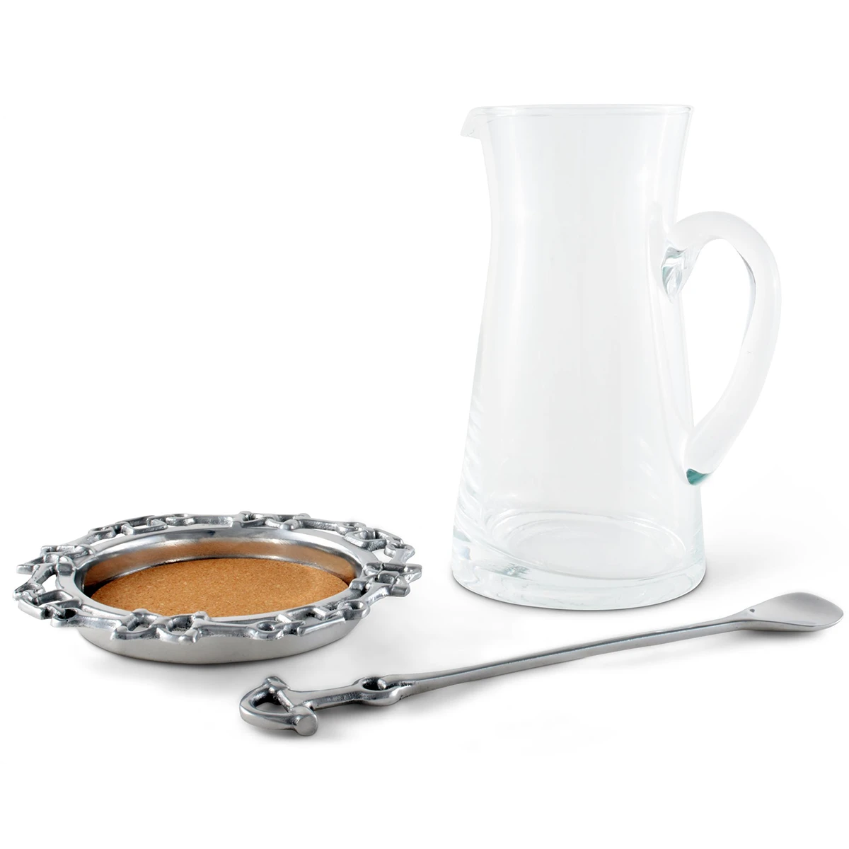 Interlocking bits encircle the pitcher’s handmade, aluminum base, which also comes with a removable cork. Another half-piece bit attaches to the ladle’s long handle, forming a sturdy grip above the glass for stirring. Create favorite drink mixes for parties or evening cocktails in this Arthur Court equestrian pitcher set. Horse lovers will admire the decorative base adorned with interlocking horse bits that comfortably and safely hold the glass pitcher in place when mixing. The included ladle features a half-piece horse bit at the end that provides a sturdy grip so it won’t slip from fingers when stirring. The ladle is long enough to reach the bottom of the pitcher so ingredients are fully mixed.