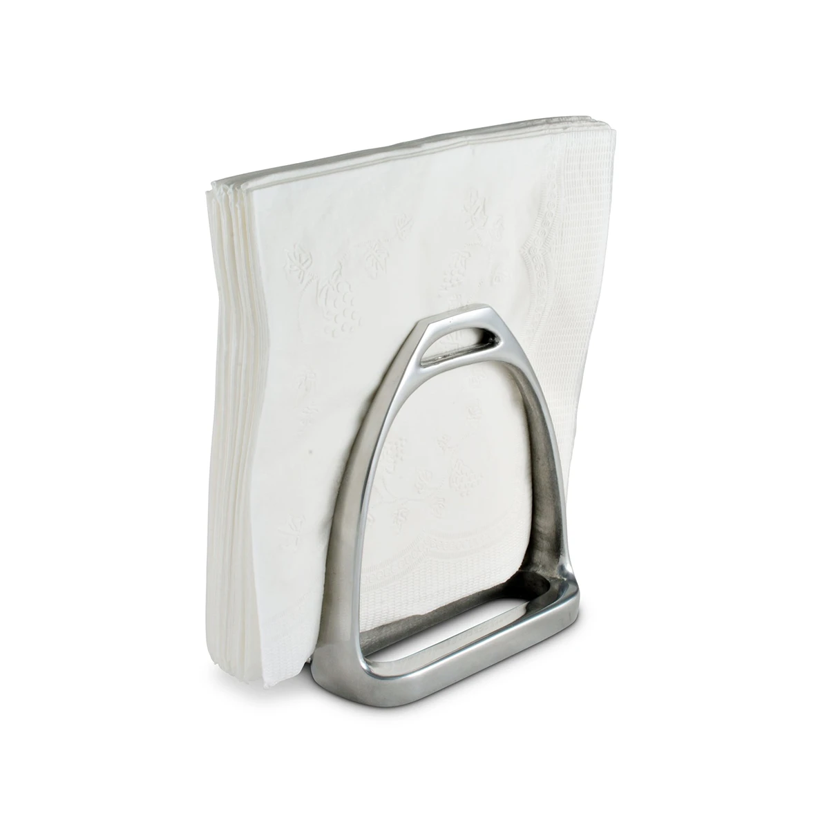Proclaim your Equestrian lifestyle with functional, hand-crafted aluminum artwork. Detailed, realistic stirrup irons, hand-crafted stand to display and dispense napkins on your table or counter. Standing design allows for easy dispensing at any time.