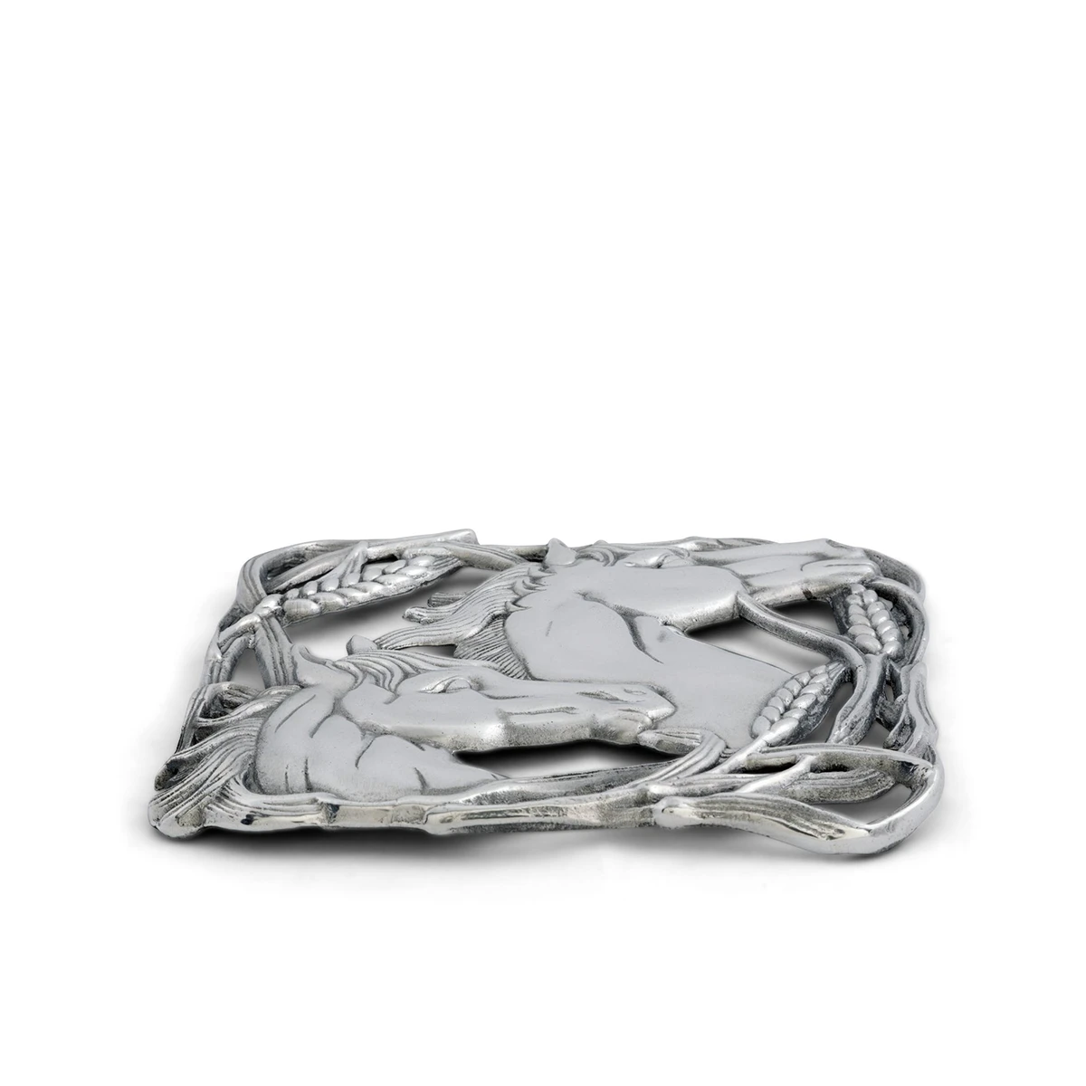 Profiles of stallions merge together in the middle of this dish as interweaving stalks of wheat surround them. The striking detail in the horses’ neck and face muscles gives this handmade, aluminum trivet a lifelike appeal.