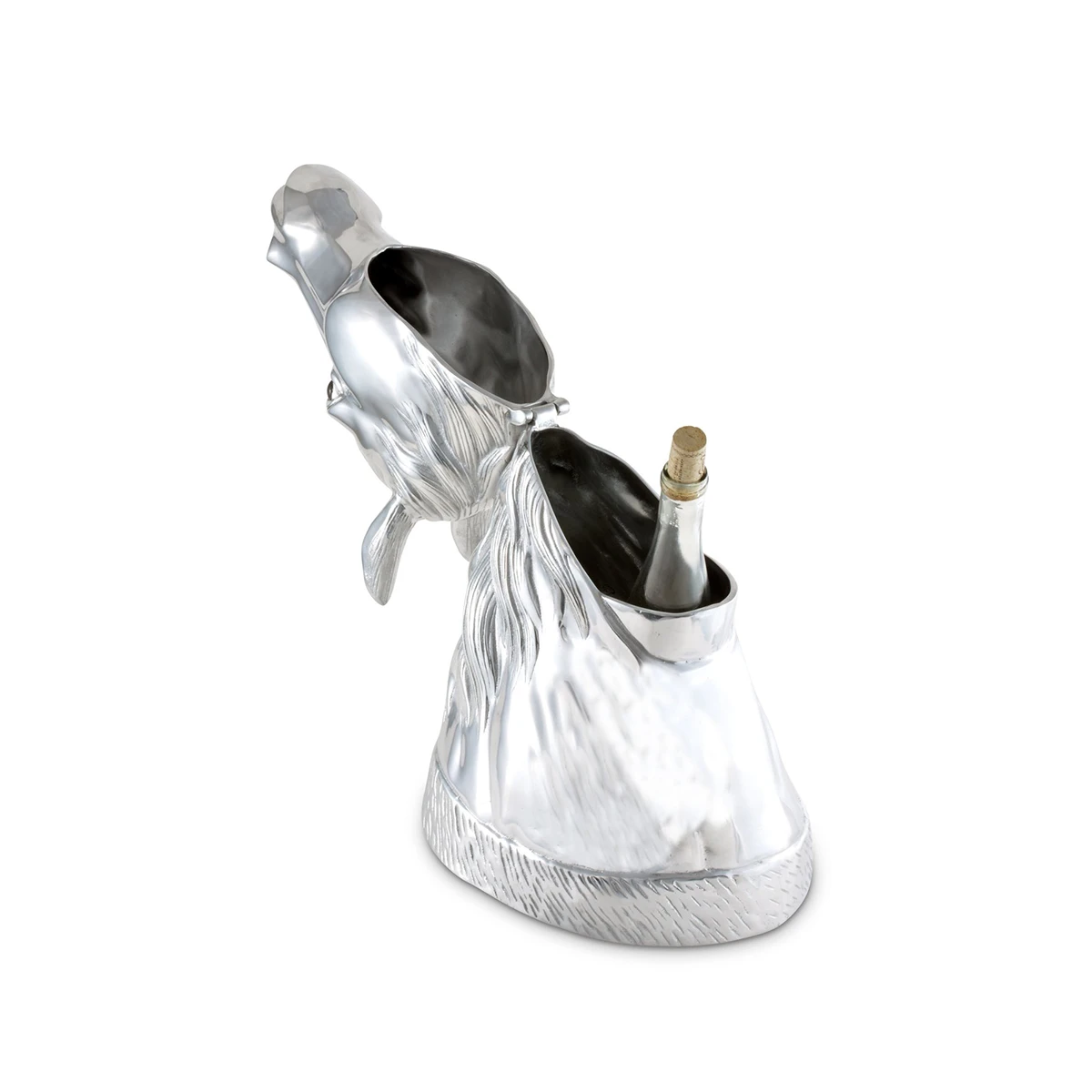 Entertain in style and wow your guests with this Arthur Court Horse Wine Cooler. This magnificent wine and champagne cooler, shaped like a horse head, stands 18-1/2 inches high when closed, and features a hinge at the base of the neck; opening to a hollow body to house the ice. His eyes are big and beautiful and his ears forward, as if listening and standing at attention. When not in use, this cooler makes a fabulous home accent piece.