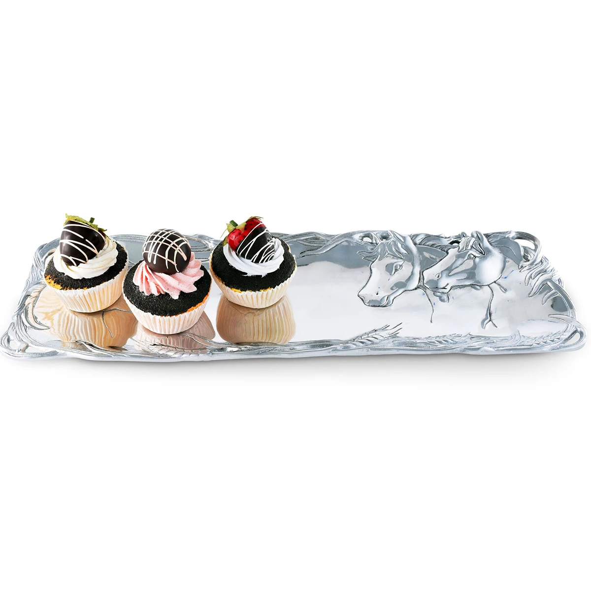 Experience nature with these majestic creatures in Arthur Court’s Horse Oblong Tray. Multiple stallions gaze at each other from opposite ends of this handmade, aluminum piece. Stalks of wheat form the tray’s openwork edges, their textured heads mixing beautifully with the horses’ detailed manes.