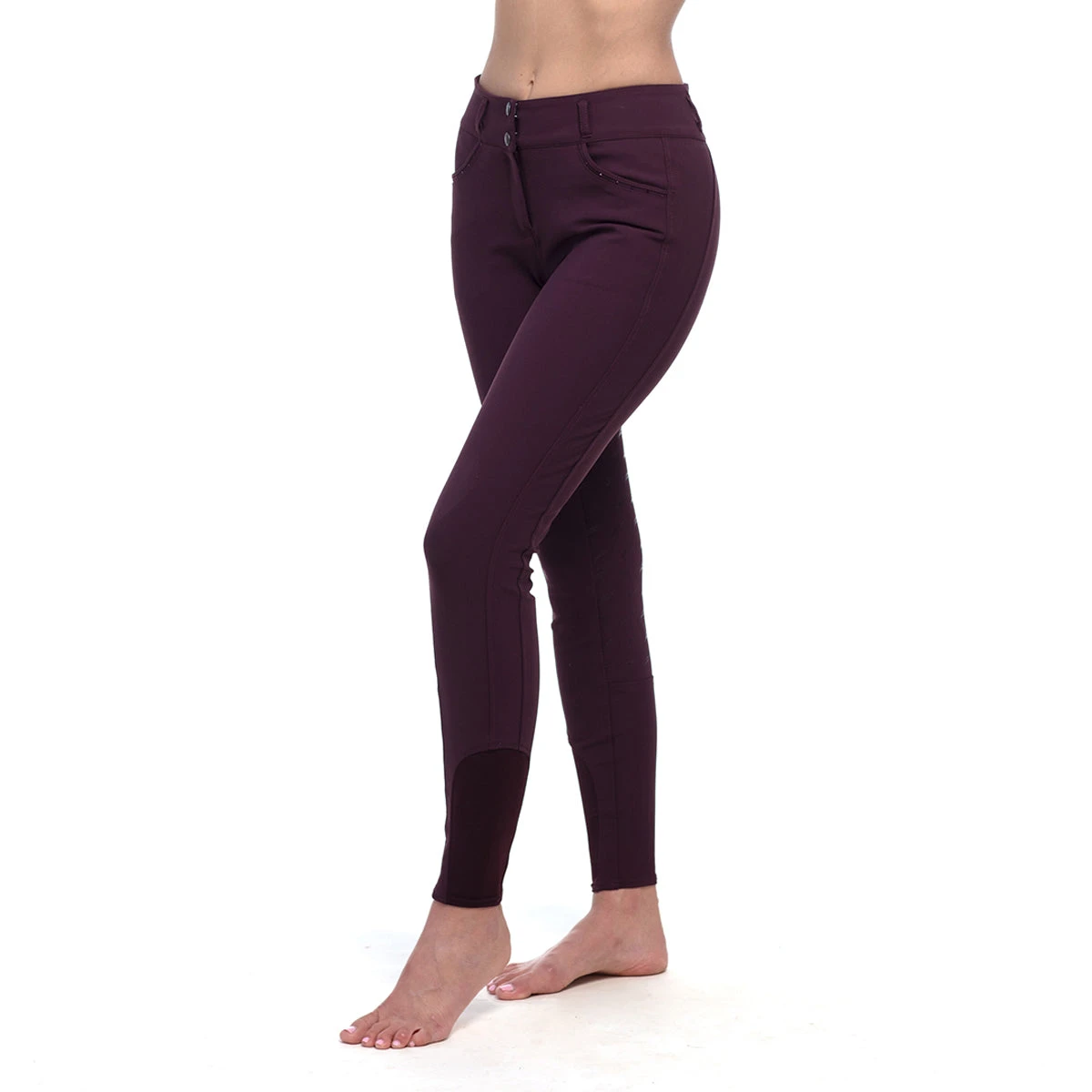 This super flattering higher rise breech is our new favorite breech. The fabric is medium body in weight and cooler feeling yet with incredible hold and mold as well as stretch and recovery. You put it on and feel like you have lost 5 lbs. Beautifully placed seams for a stunning flattering fit. Front scoop pockets with beautiful subtle crystals around pocket. Pretty bling embroidery on back beltloop. Sock style bottom for a snug fit under your boots. Patterned Silicone for grip.