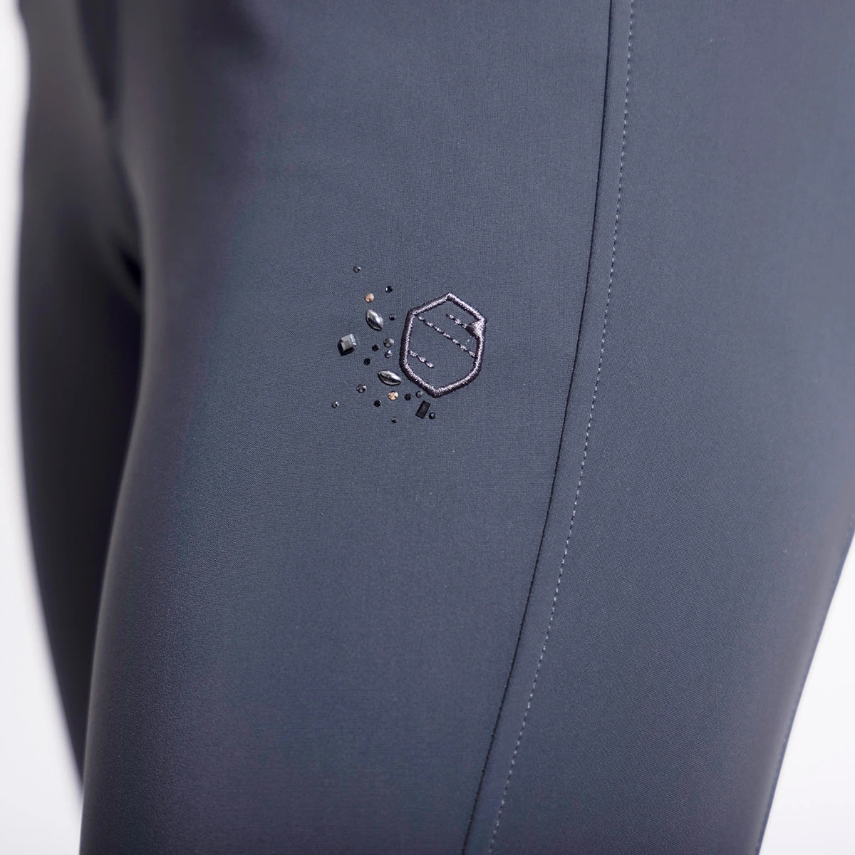 The details of the pockets and loops of the Mathilde are in satin. This model has only one front button. The seat is fully sewn. A large pocket for smartphone is present on the right side. This pant is unique thanks to its embroidered coat of arms illuminated with Swarovski® crystals on the thigh. This model is the perfect match between simplicity and refinement.