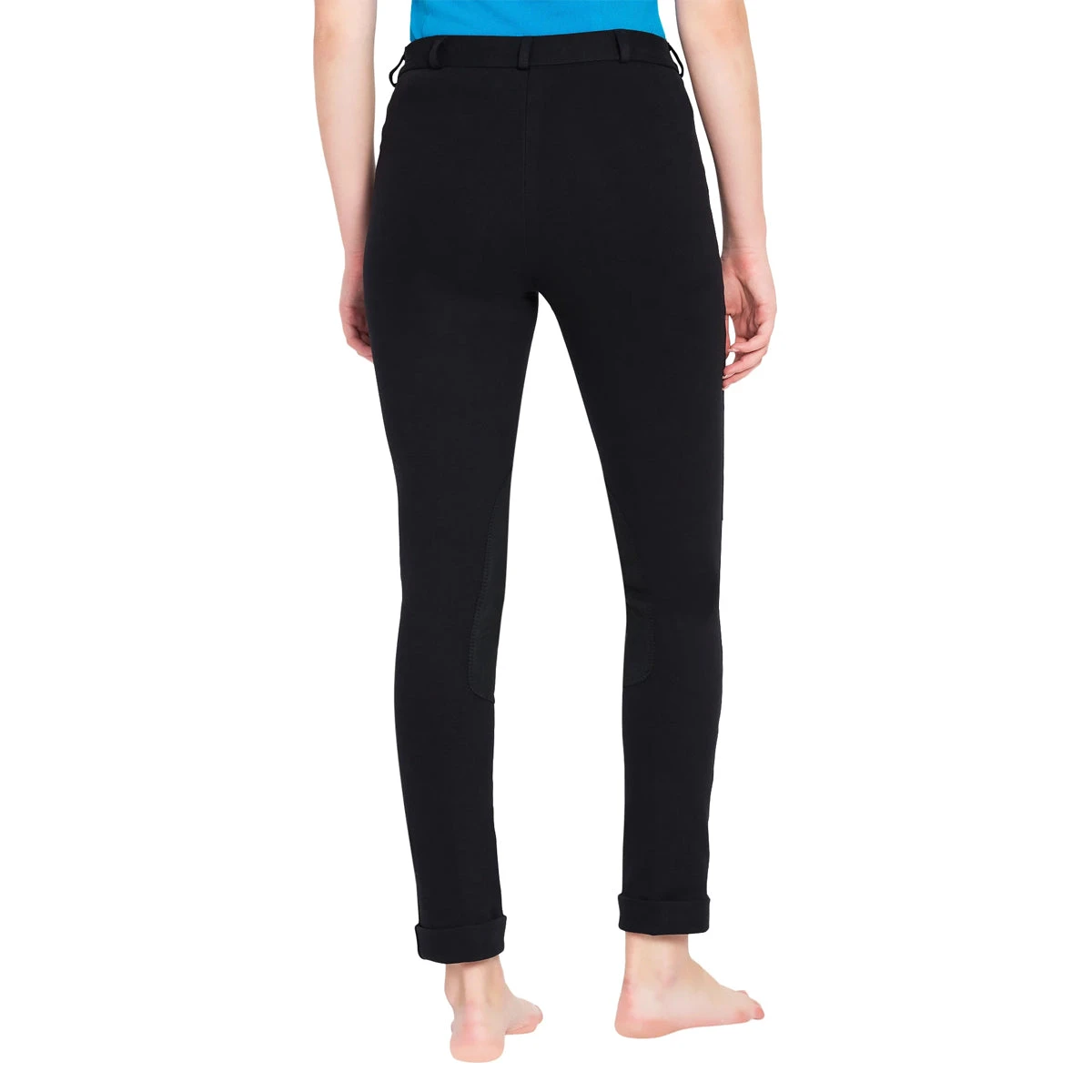 The TuffRider Ladies Cotton Jodhpurs are a great choice for adult amateur riders! They are available in two colors for showing and schooling, you’ll love the fit and feel. This cotton-based jodhpurs are soft, stretchy, and fit slightly lower on the waist. The traditional UltraGripp knee patches on riding pants will help avoid slipping in the saddle and the jods straps on the cuff are removable. Care Instructions: Turn inside out and wash with warm water (medium temperature) and mild detergent. Tumble dry low, no bleach, must wash separately.